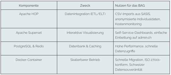 • Begrenztes Budget: Proprietäre Lösungen wie Tableau (>100’000 CHF/Jahr) ungeeignet